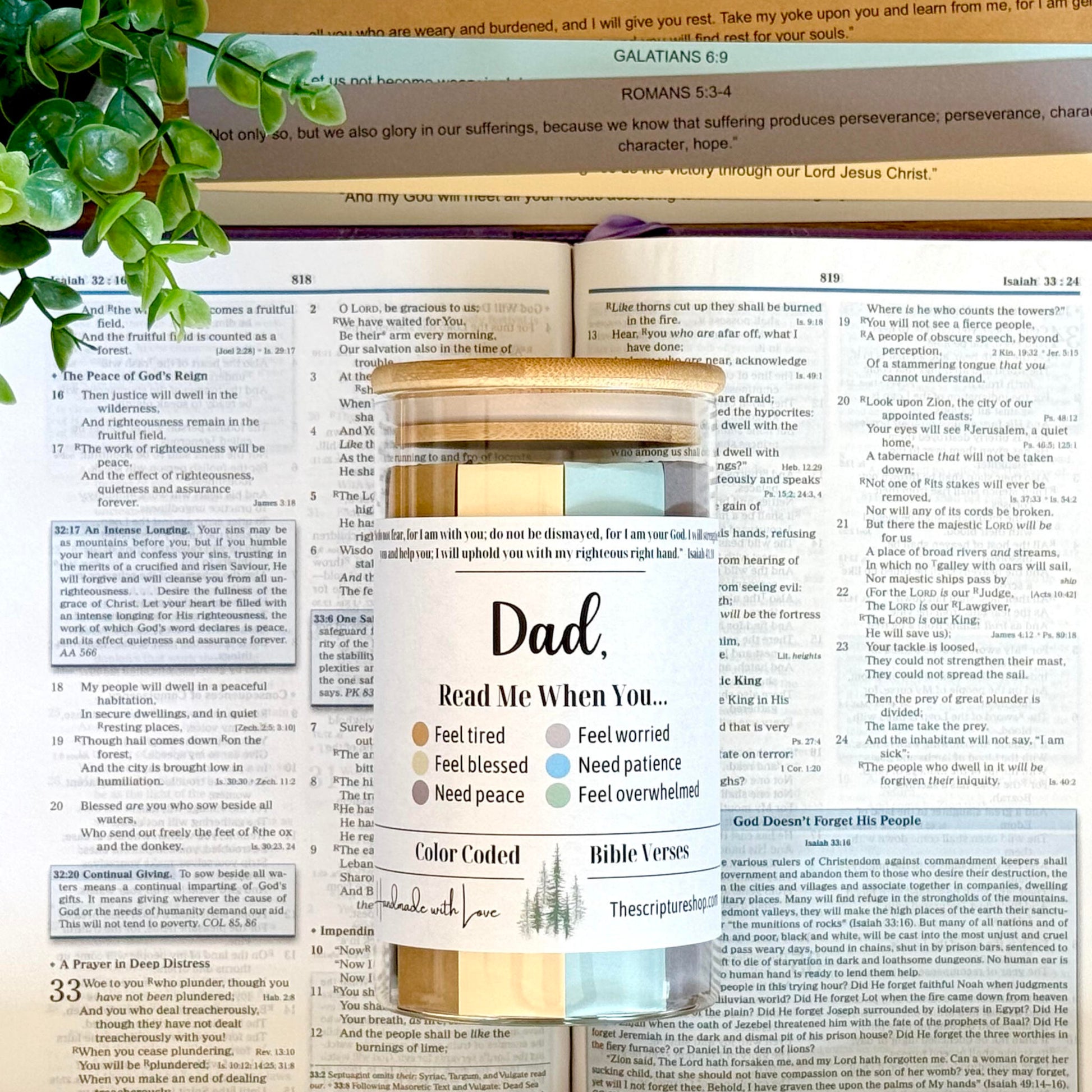 The Read Me When Bible Verse Jar contains 62 Color-Coded Bible verses for coping with different emotions that are common to fathers.